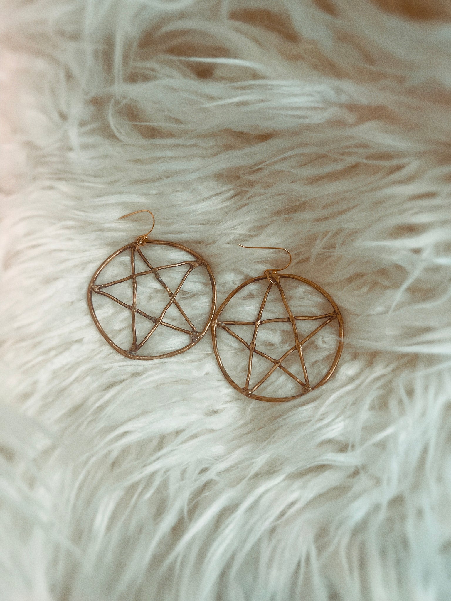 Hand formed and hammered in brass, these pentacle earrings are lightweight and sure to turn heads. Make an impression with this protective design.