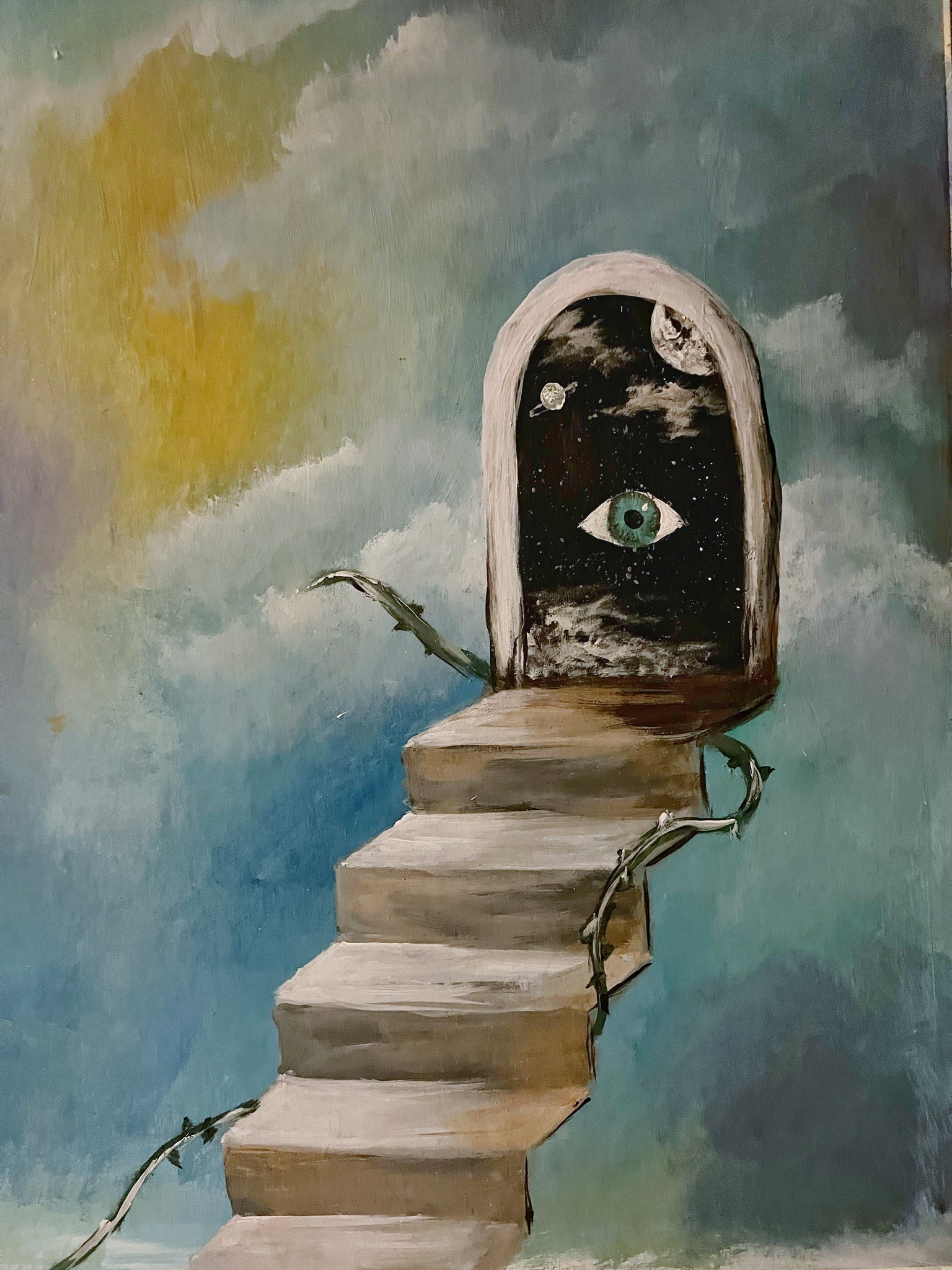 Acrylic on board. Matted and framed in metal gold frame.
